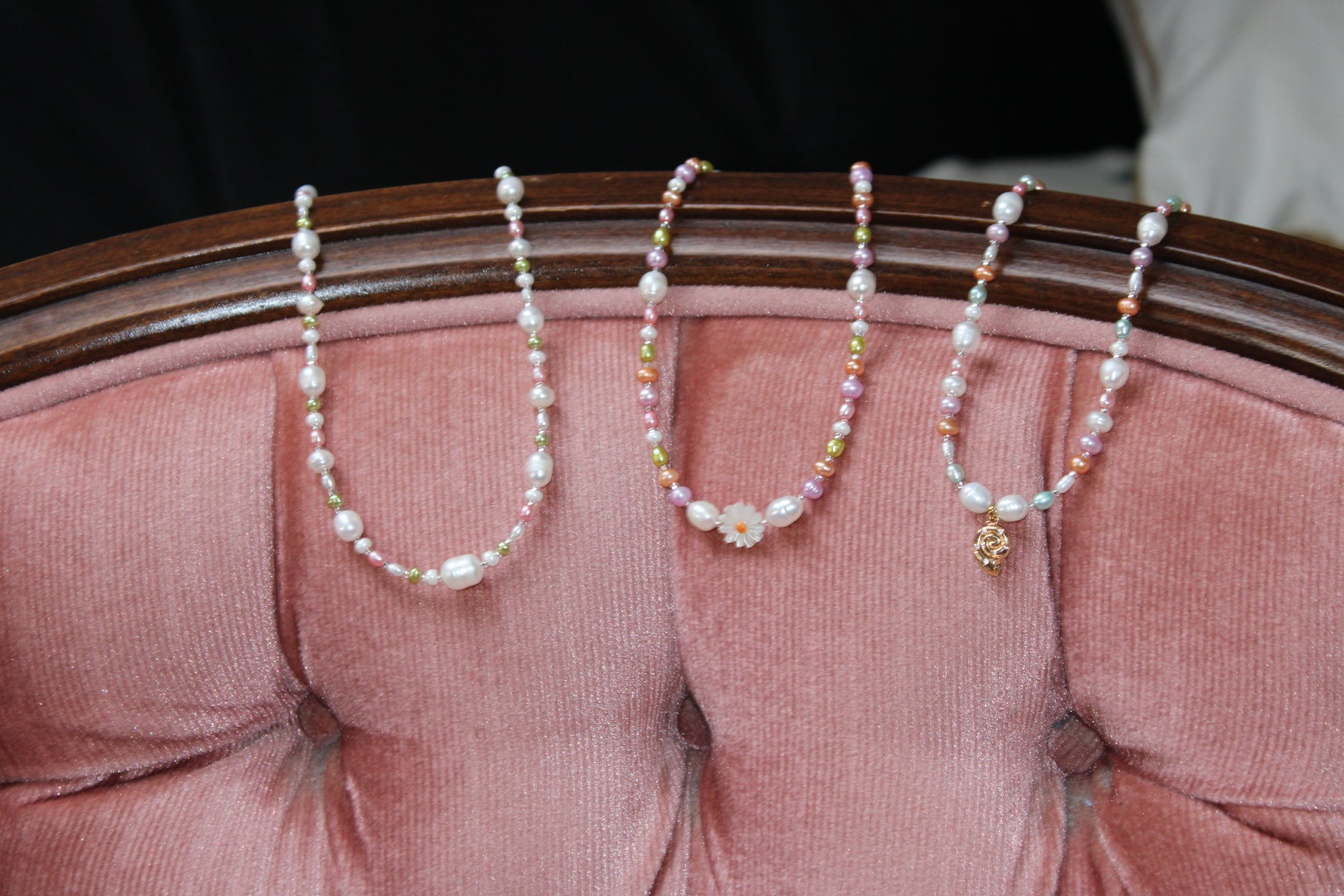 The coloured pearls are often mistaken for glass or imitation, but they are genuine freshwater pearls. Their colour comes from careful dyeing, a common and traditional process that allows pearls to take on dreamy, unexpected shades while still keeping their natural lustre, texture and individuality. Each one is slightly different, which is part of what makes them so special!